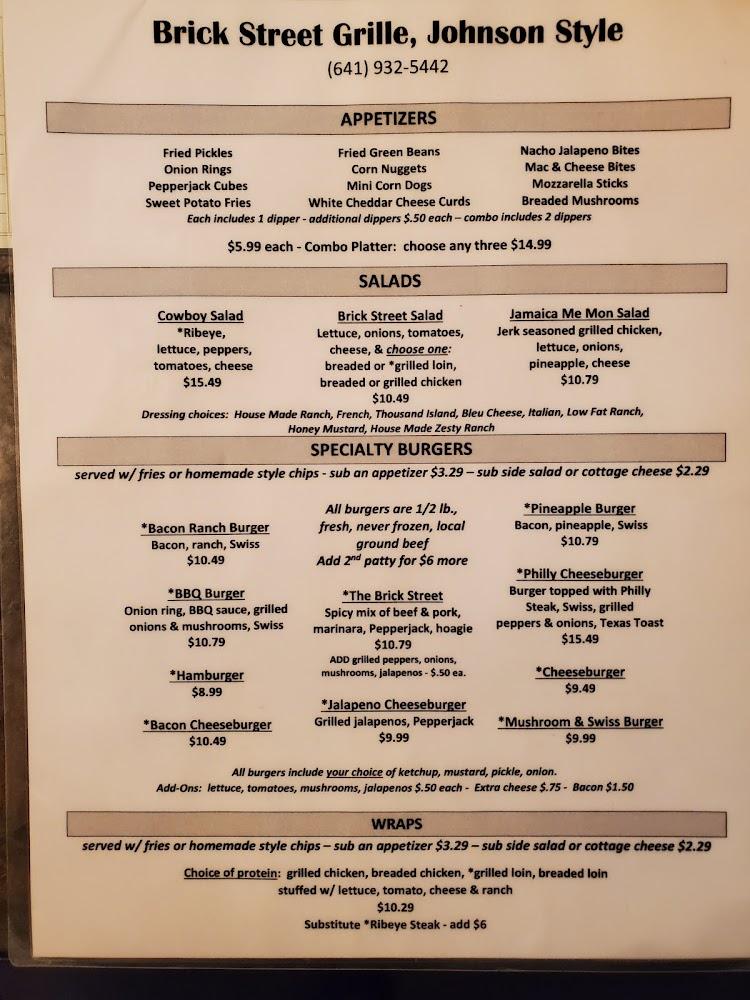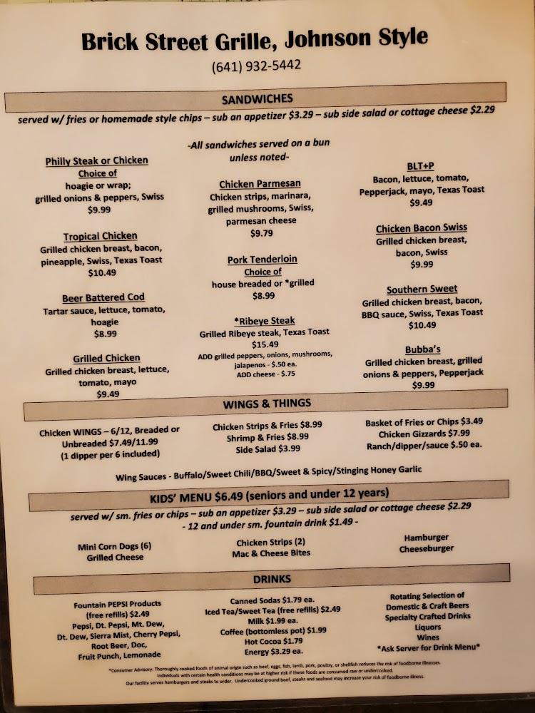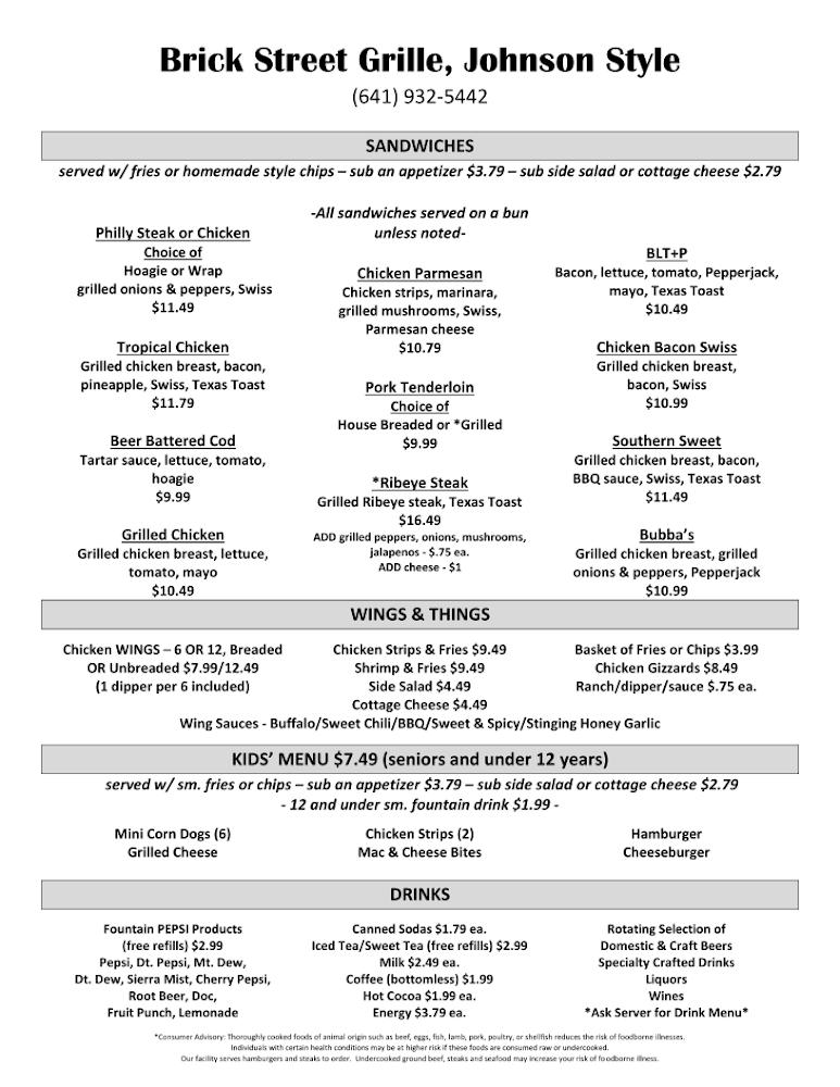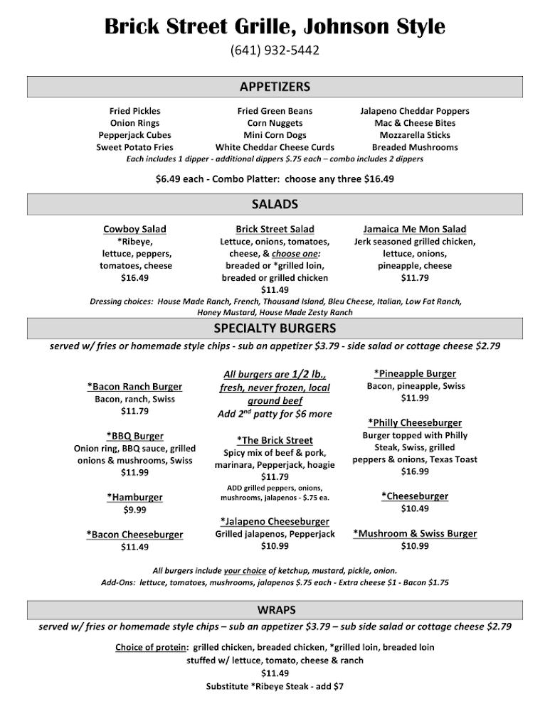 Welcome to Brick Street Grille, Johnson Style – your go-to spot for delicious American cuisine in Albia, IA! Indulge in our mouthwatering burgers, flavorful sandwiches, fresh salads, and wraps, all paired with a fantastic selection of craft beers and cocktails. Enjoy your meal in our relaxed atmosphere, whether on the patio or comfortably seated indoors. We cater to families, groups, and solo diners, offering quick service and takeout options. With wheelchair accessibility, free Wi-Fi, and a friendly staff, Brick Street Grille is the perfect destination for lunch or dinner. Come savor the local flavors with us!